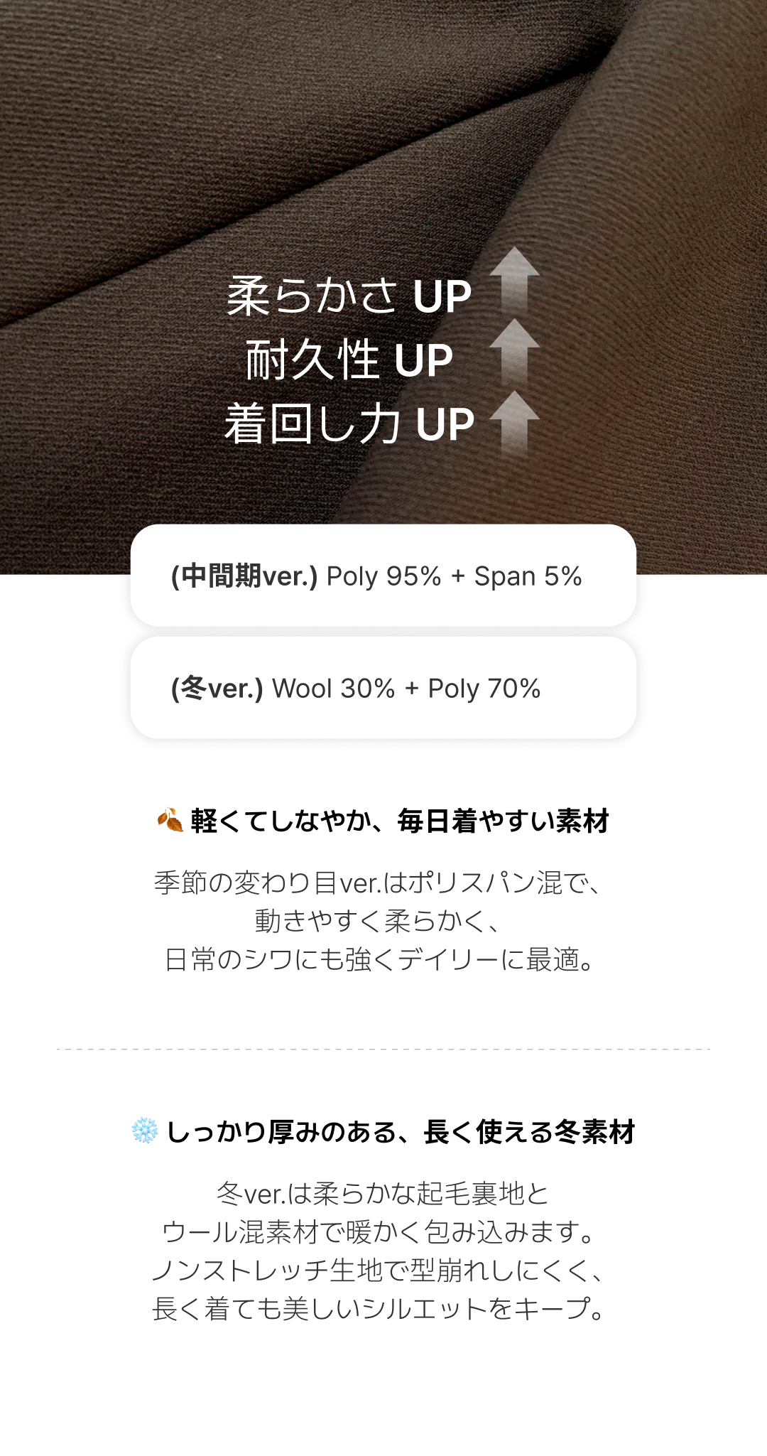 | 素材 | POLYESTER(95%), SPAN, SPANDEX(5%), POLYESTER(96%), SPAN, SPANDEX(4%) |